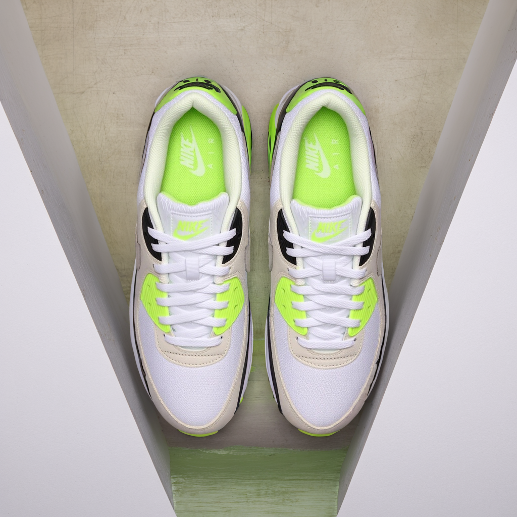 Experience the ultimate comfort and style with NIKE's AIR MAX 90 in lime green and white. The cool gray accents add a touch of sophistication to these iconic sneakers. Built for performance and designed for fashion, these shoes are perfect for athletes and fashion enthusiasts alike.